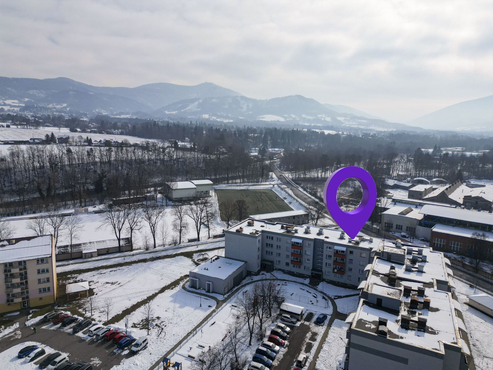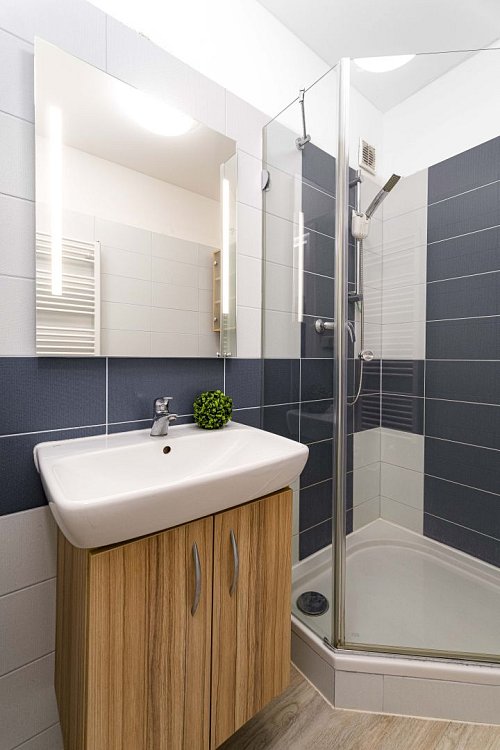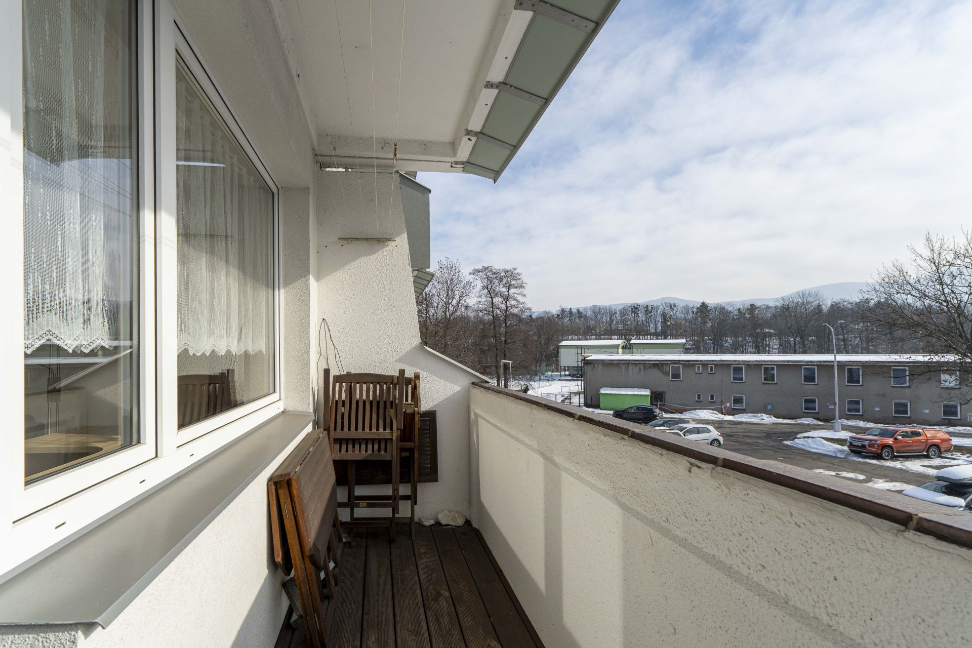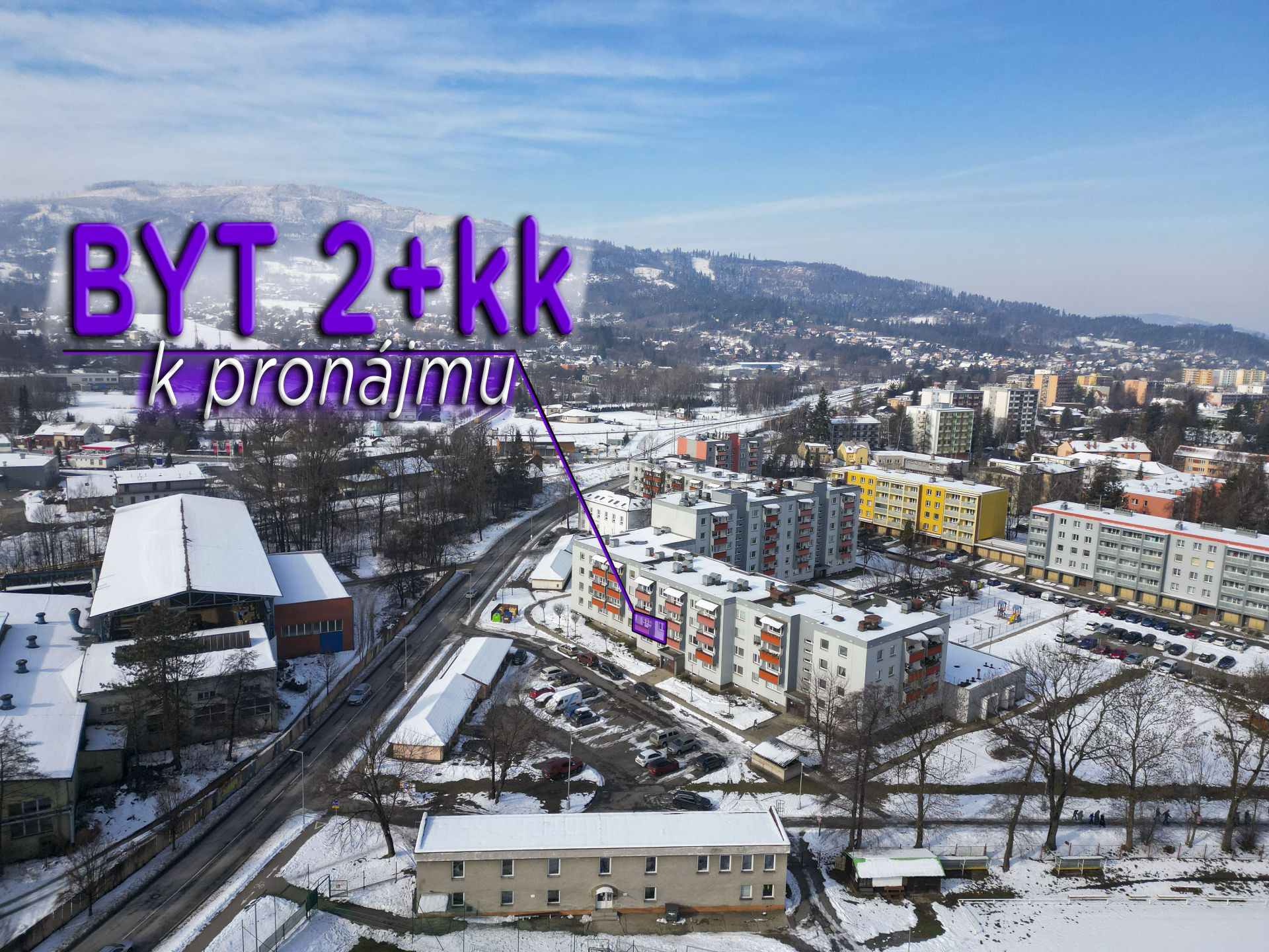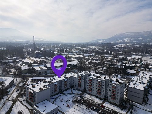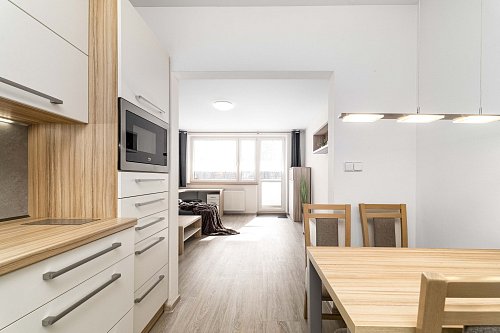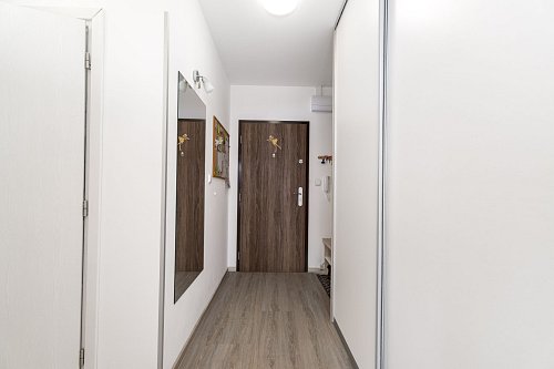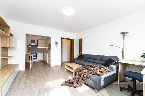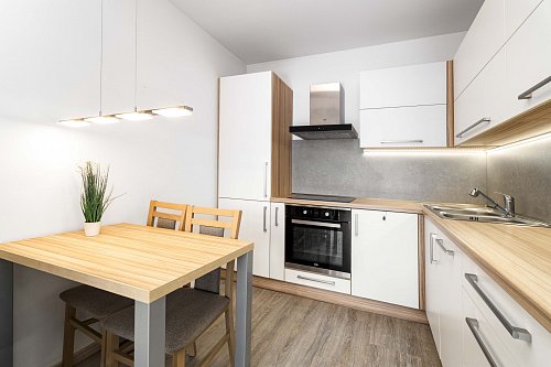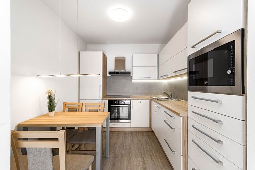Byt je dispozičně řešen velkým vybaveným obývacím pokojem spojeným s kuchyňským koutem a východem na prostorný balkón. Z balkónu je pěkný výhled na Lysou horu a Smrk. Dále je v bytě ložnice s manželskou postelí, koupelna se sprchovým koutem a pračkou, WC odděleně. Na chodbě je velká vestavěná skříň s dostatkem úložných prostor. Kuchyň je kompletně vybavena spotřebiči - indukční varnou deskou, myčkou, elektrickou i mikrovlnou troubou, ledničkou a mrazákem. Je zde také jídelní stůl se židlemi.