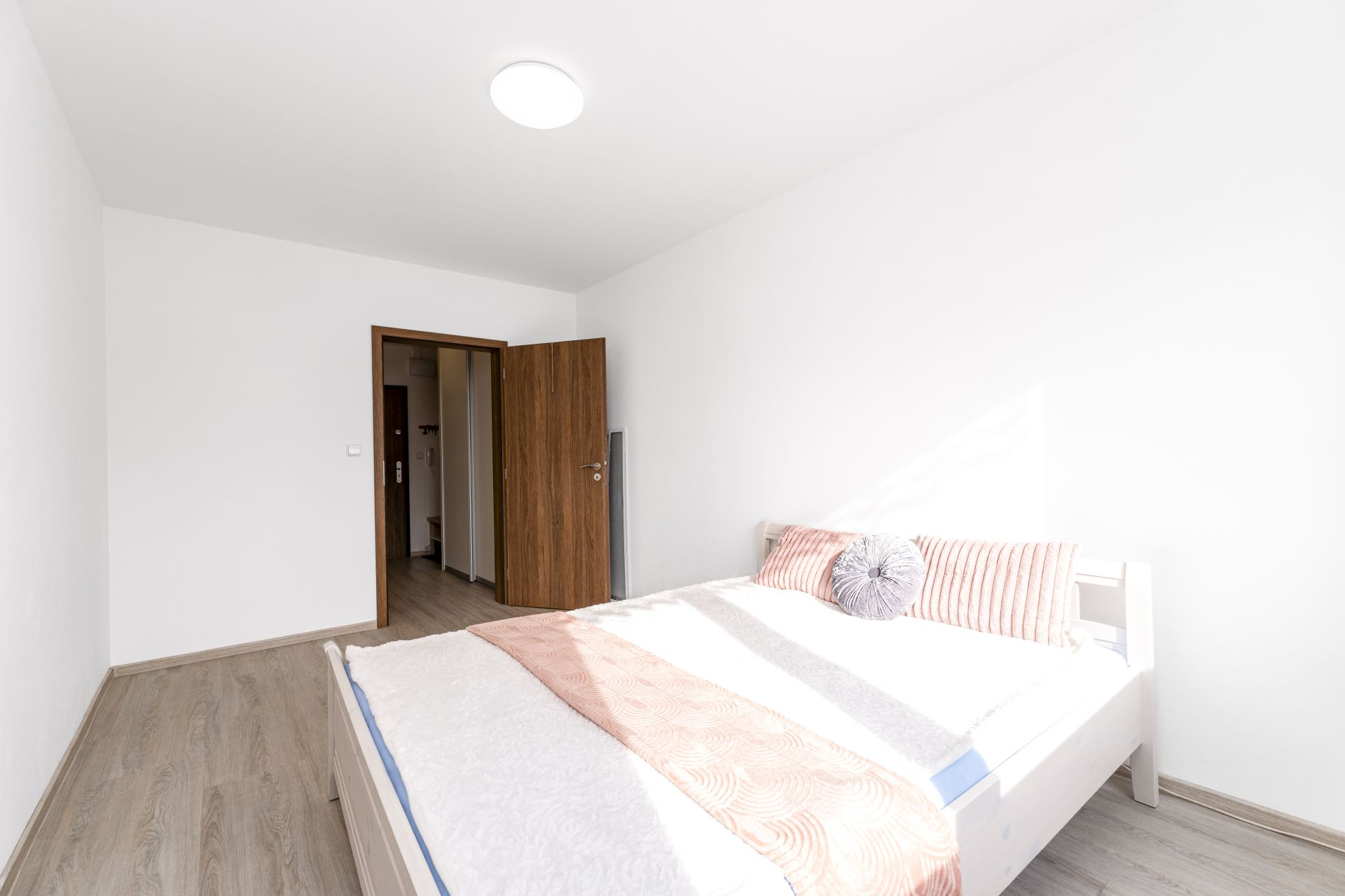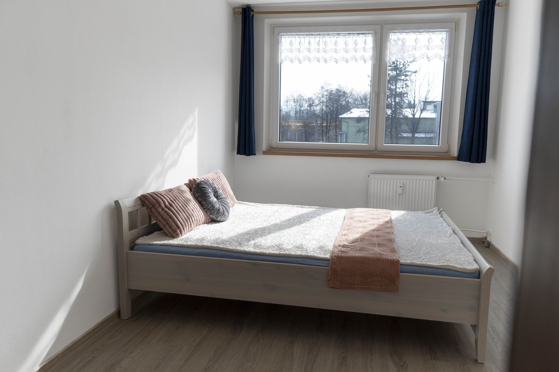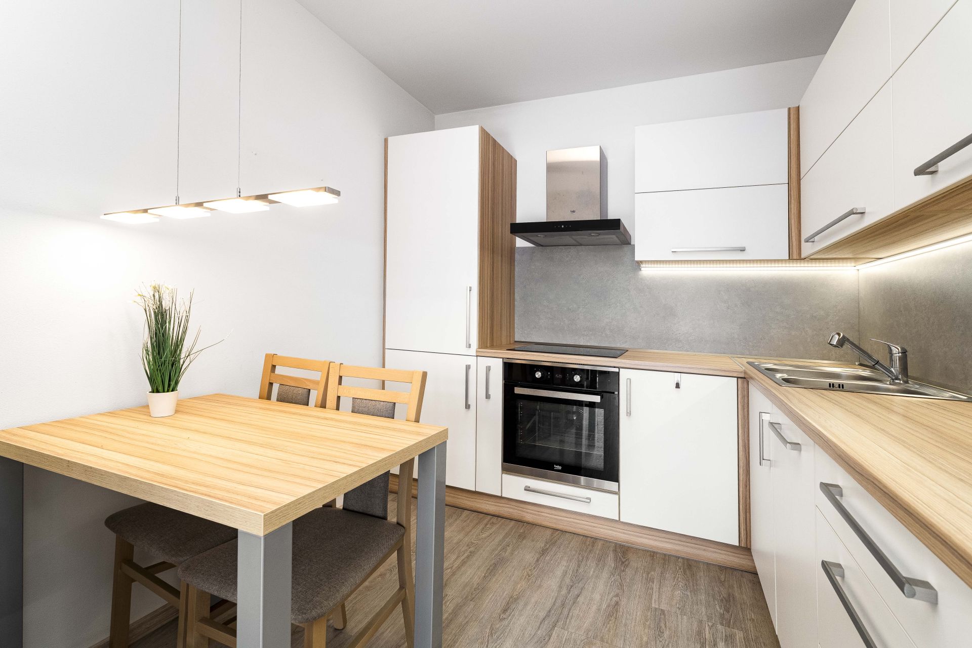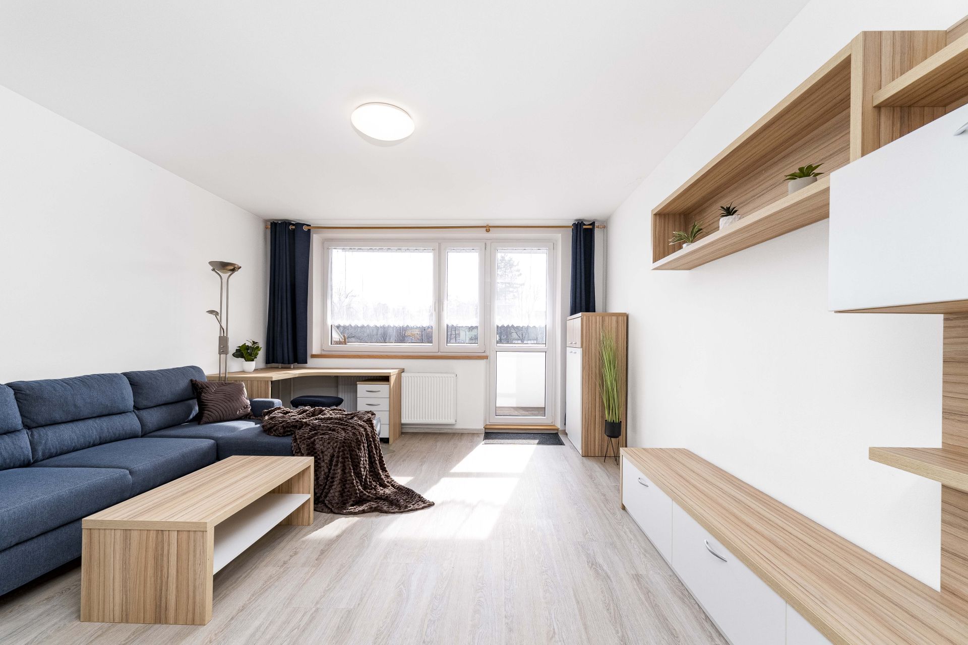 Byt je dispozičně řešen velkým vybaveným obývacím pokojem spojeným s kuchyňským koutem a východem na prostorný balkón. Z balkónu je pěkný výhled na Lysou horu a Smrk. Dále je v bytě ložnice s manželskou postelí, koupelna se sprchovým koutem a pračkou, WC odděleně. Na chodbě je velká vestavěná skříň s dostatkem úložných prostor. Kuchyň je kompletně vybavena spotřebiči - indukční varnou deskou, myčkou, elektrickou i mikrovlnou troubou, ledničkou a mrazákem. Je zde také jídelní stůl se židlemi.